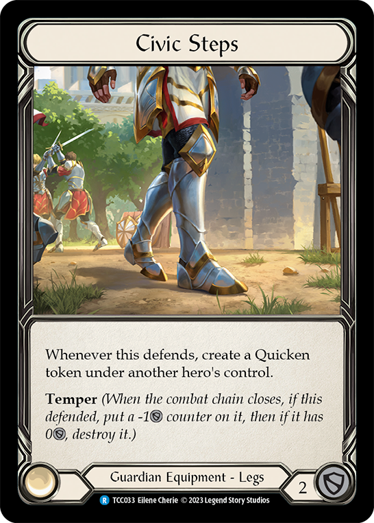 Whenever this defends, create a Quicken token under another hero's control. Temper (When the combat chain closes, if this defended, put a -1{d} counter on it, then if it has 0{d}, destroy it.)