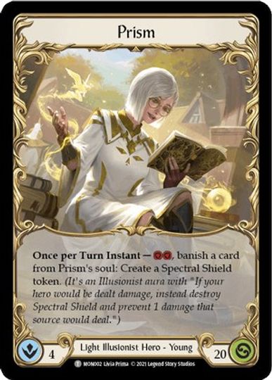 Once per Turn Instant - [2 Resource], banish a card from Prism's soul: Create a Spectral Shield token. (It's an Illusionist aura with "If your hero would be dealt damage, instead destroy Spectral Shield and prevent 1 damage that source would deal.")